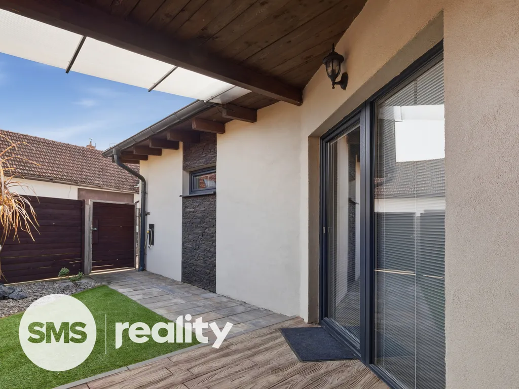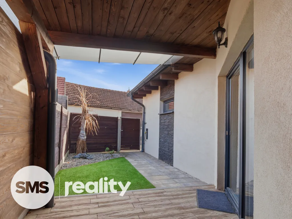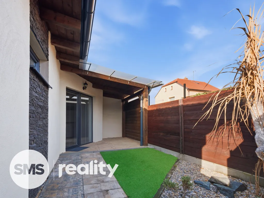 Velkou předností domu je venkovní terasa, na kterou se vstupuje přímo z obývacího pokoje francouzským oknem. Terasa plynule navazuje na oplocenou zahrádku, která poskytuje dostatek soukromí a příjemné místo pro relaxaci, posezení či letní grilování. K dispozici je také půdní úložný prostor nad ložnicí.