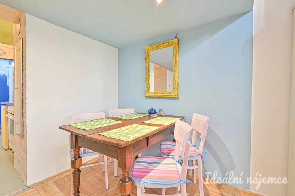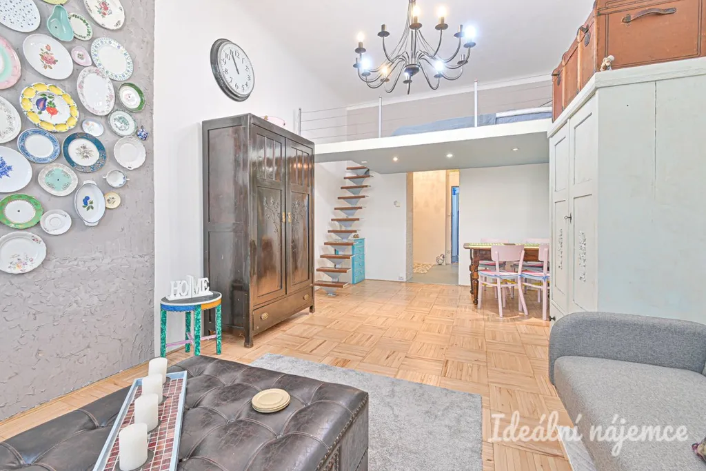 Byt se nabízí plně vybavený. Kuchyně elektrickou troubou, varnou deskou, lednicí, pračkou a digestoří. Obývací část disponuje pohovkou, šatními skříněmi, jídelním stolem se židlemi. Díky vysokým stropům je spací část vyřešena na patře. V koupelně je sprchový kout, toaleta a umyvadlo.