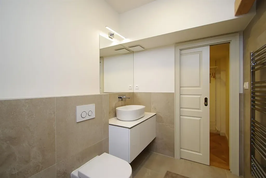 Prostorný klimatizovaný moderní byt 3+kk (2 ložnice, 3 koupelny), o celkové ploše 199 m2, je situovaný ve 4. patře zrekonstruované rezidenční budovy, která disponuje plně vybavenou posilovnou a je umístěna v atraktivní lokalitě Praha 1 Nové Město, v Bolzanově ulici.