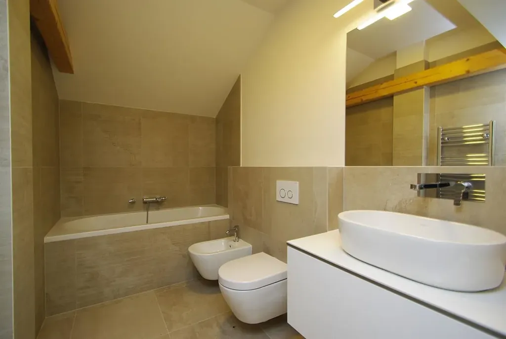 Interiér bytu je zařízený italským designovým nábytkem. Byt dispozičně nabízí prostorný obývací pokoj, který je spojen s kuchyňským koutem s vestavěnými spotřebiči (lednice s mrazákem, trouba, varná deska, mikrovlnná trouba, myčka) včetně jídelního prostoru. Z obývacího pokoje je možné vstoupit na přilehlý balkon (3 m2), a na velkou terasu (63 m2). Dále byt disponuje dvěma ložnicemi; jedna z ložnic má ještě v patře galerií. Obě ložnice mají vlastní koupelnu a třetí koupelna se sprchovým koutem a toaletou je samostatná. K bytu náleží sklep.