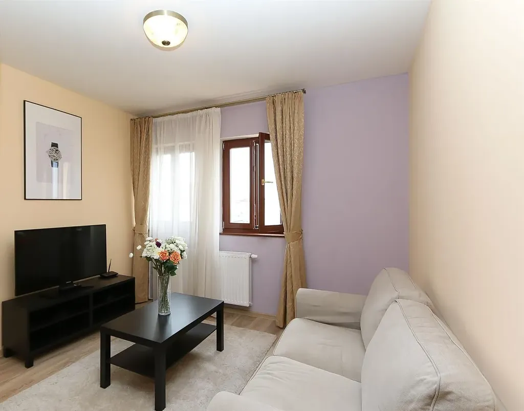 Interiér bytu je zařízený a dispozice nabízí vstupní chodbu, obývací pokoj s plně vybaveným kuchyňským koutem, hlavní ložnici s vestavěnou šatní skříní, druhou menší ložnici a moderní koupelnu. Další vybavení bytu: trouba, sporák/trouba, mikrovlnná trouba, varná konvice, kávovar, toustovač, TV, satelitní přijímač, WiFi, pračka se sušičkou, žehlička, žehlící prkno, vysavač.