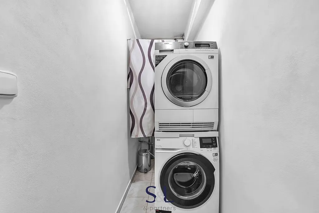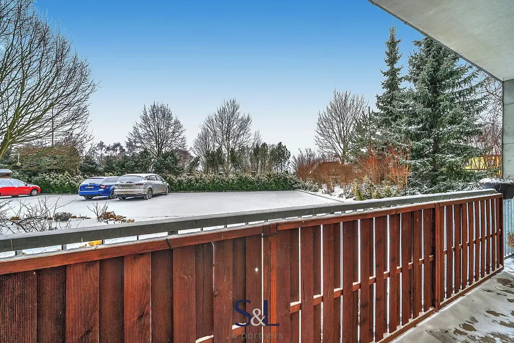 Z lodžie je navíc přímý vstup na společnou zahradu před domem, což vytváří příjemné propojení interiéru s venkovním prostorem — ideální pro relaxaci, posezení nebo bezpečný prostor pro děti.