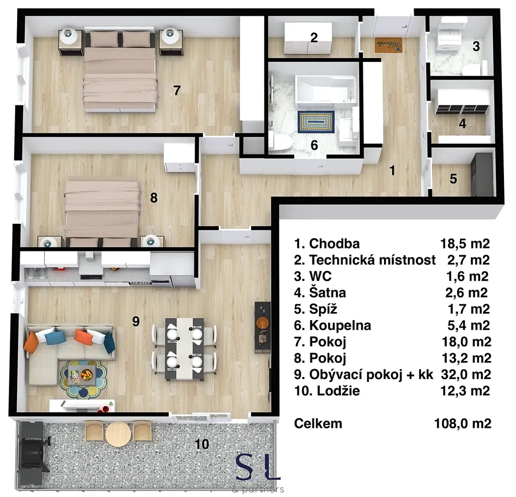 Velkým benefitem bytu je lodžie o velikosti 12 m², která poskytuje prostor srovnatelný s menší terasou.