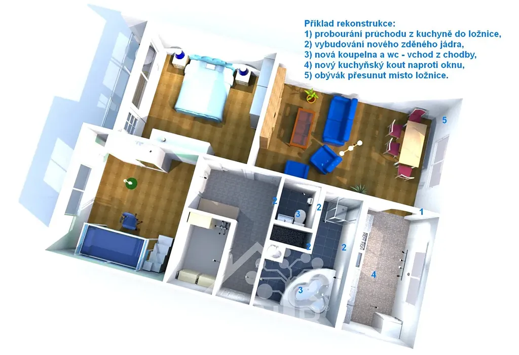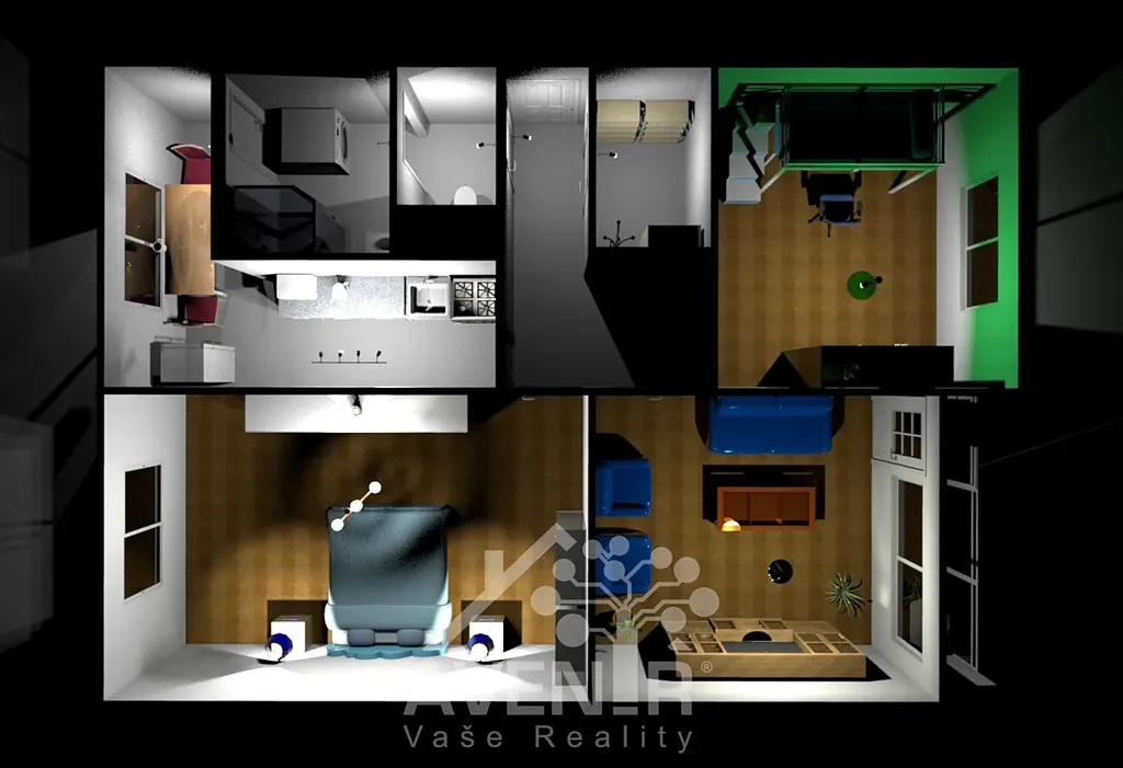 Skládá se z obývacího pokoje s lodžií, ložnice, dětského pokoje, kuchyně do tvaru "L", průchozí koupelny s wc, chodby a komory (šatny). Součástí prodeje je sklepní kóje.