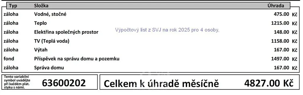 Energie: elektřina převážně v hliníku 220 V, studená voda dálkově, teplá voda a vytápění dálkově, plyn na vaření.