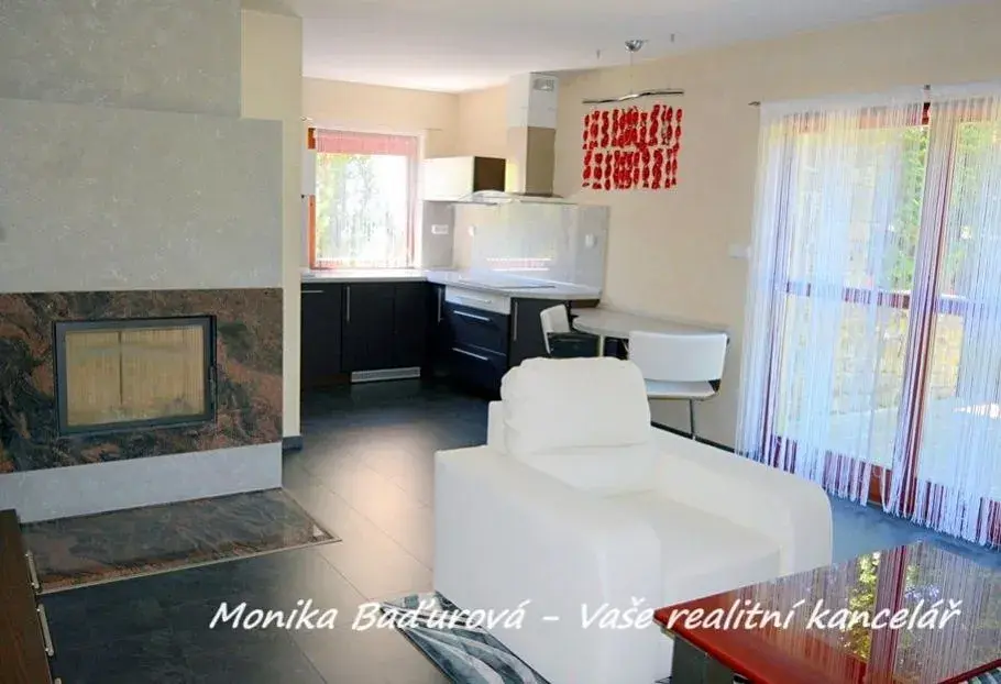 Druhý byt má dispozici 2+kk, v přízemí se nachází obývací pokoj s krbem a moderním kuchyňským koutem, ke kterému přiléhá terasa s nádherným výhledem do zahrady. V podkroví se nachází velká ložnice se šatnou a zajímavě řešenou koupelnou. Tento byt je kompletně zrekostruován.