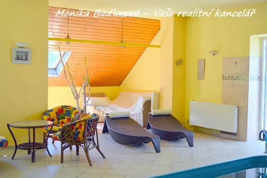 Když z vily vystoupíte na žulou vydlážděné nádvoří, uvidíte další dům, který má zastavěnou plochu 218 m2 a ve kterém se nachází velký prostor, který sloužil jako tělocvična, také vnitřní bazén o velikosti 4 x 4 m, kancelář, sprcha a úložné prostory. Na tyto prostory navazují 3 velké skleníky a zahrada.