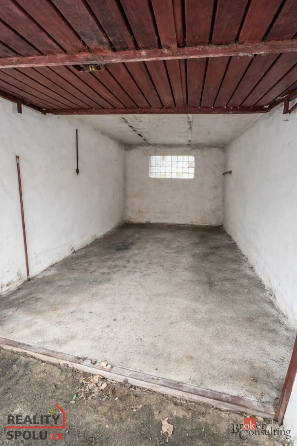 Garáž v dobrém stavu s novou střechou. Vjezd zajišťují vyklápěcí plechová vrata. Dostatek úložného prostoru.
