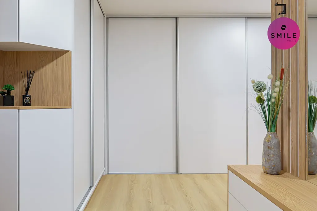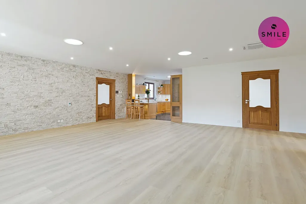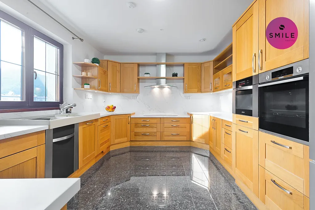 Masivní dřevěné interiérové dveře, prostorná kuchyňská linka s vestavěnými spotřebiči, podlahy vinylové.