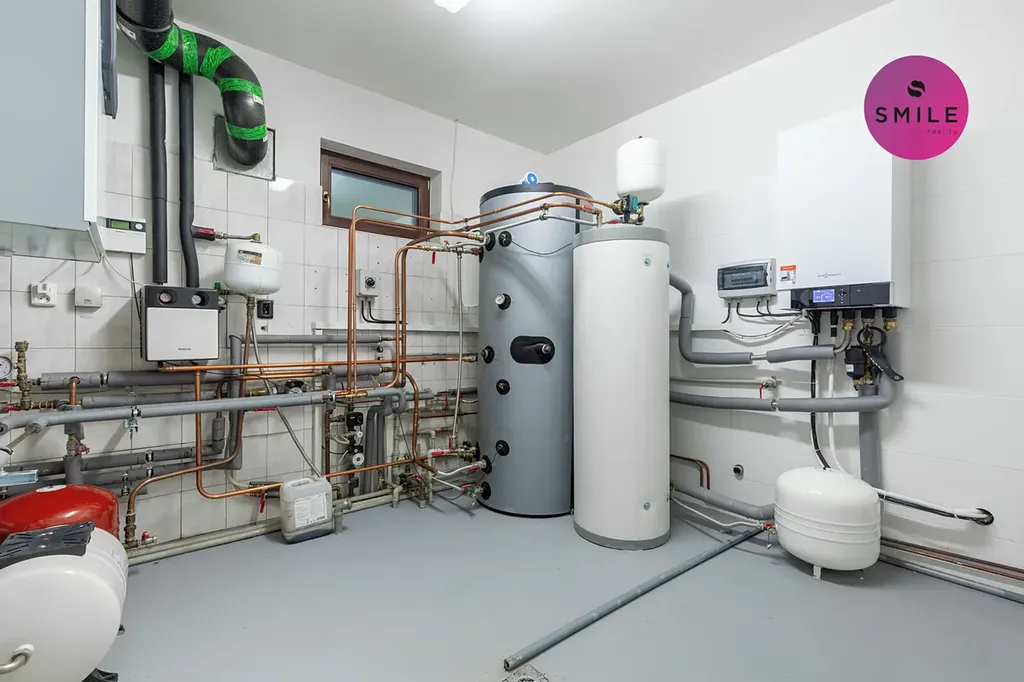 Dům byl kolaudován v roce 2008. Je zde tepelné čerpadlo Viesmann, záložní plynový kotel, rekuperace, bojler se solárním ohřevem, klimatizace. V obývacím pokoji vám zpříjemní rodinnou atmosféru krb na dřevo.
