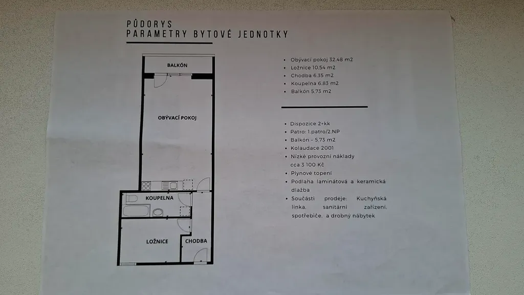 Byt o výměře 56 m2 + 6 m2 balkon, který je dispozičně řešen jako 2+kk/B, je situován v 2. nadzemním podlaží cihlového domu z r. 2001.