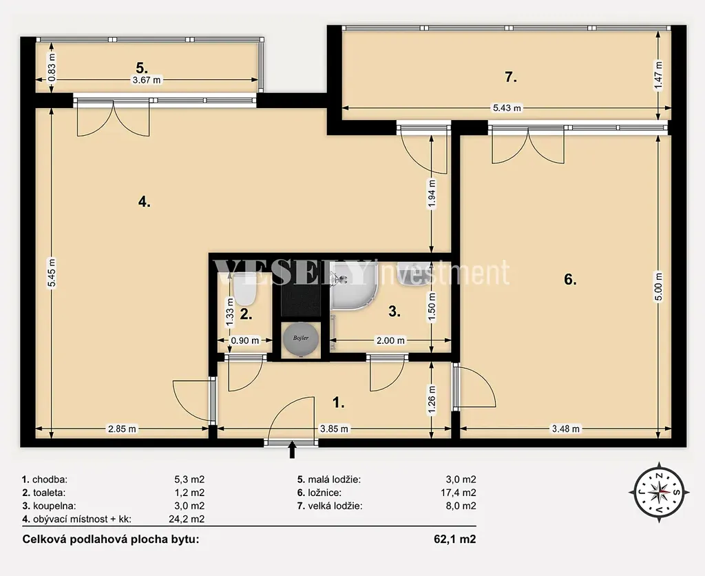 Nabízíme k prodeji světlý, západně orientovaný, prostorný byt o dispozici 2+kk a celkové 62,1 m² se dvěma lodžiemi. Byt je situován v cihlové nástavbě na střeše panelévého domu a nabízí krásné výhledy do okolí. Nachází se v 9. NP a je umístěn v žádané lokatitě v těsné blízkosti OC Letňany.