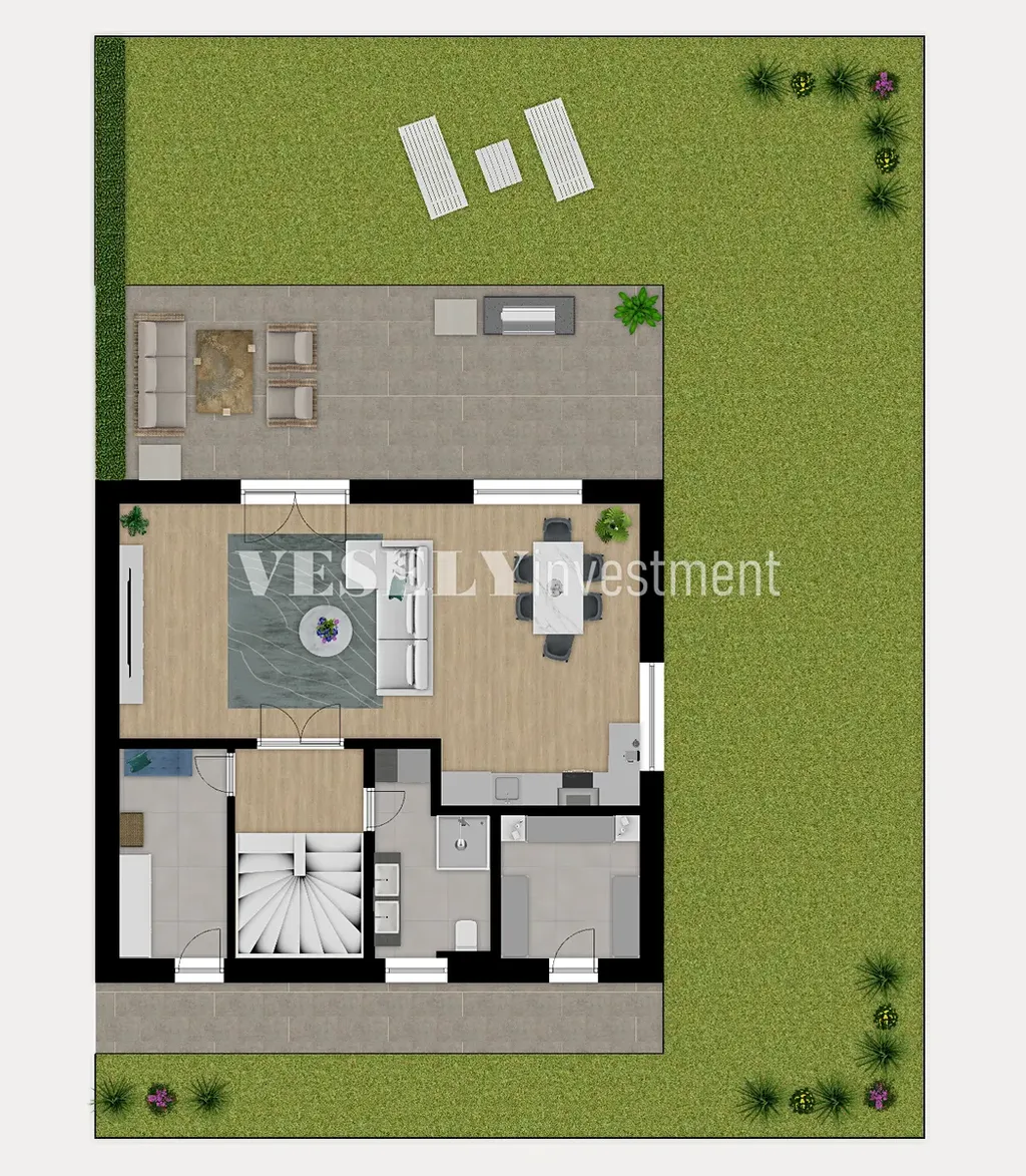 Vstup do domu tvoří vstupní chodba (7,6 m2) se vstupem do chodby se schodištěm (7,7 m2), ze které se dostanete do 2NP. Z chodby jsou dále vstupy do velkorysého obývacího pokoje s kuchyní (41,72 m2) a koupelny se záchodem (6,4 m2). V 1.NP se také nachází technická místnost (technické zázemí), která má vlastní vstup z pozemku.