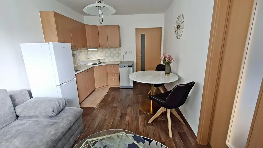 Dispozičně je byt řešen jako malý obývací pokoj spojený s kuchyňským koutem, samostatná ložnice, předsíň a koupelna spojená s toaletou.