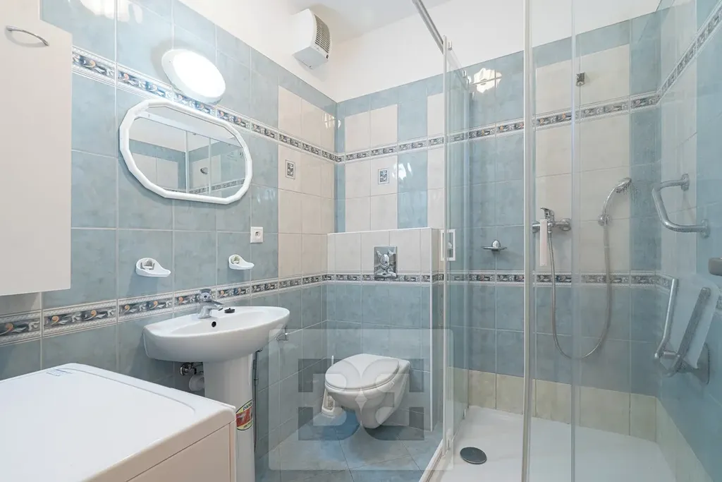 Dispozice bytu je velmi praktická. K dispozici jsou dvě předsíně, přičemž v každé se nachází skříň poskytující dostatek úložného prostoru. Samostatná kuchyň je umístěna na opačné straně od obytného pokoje. Kuchyň je vybavena sporákem, lednicí a nabízí množství úložných skříněk. V koupelně se nachází sprchový kout, toaleta a pračka.
