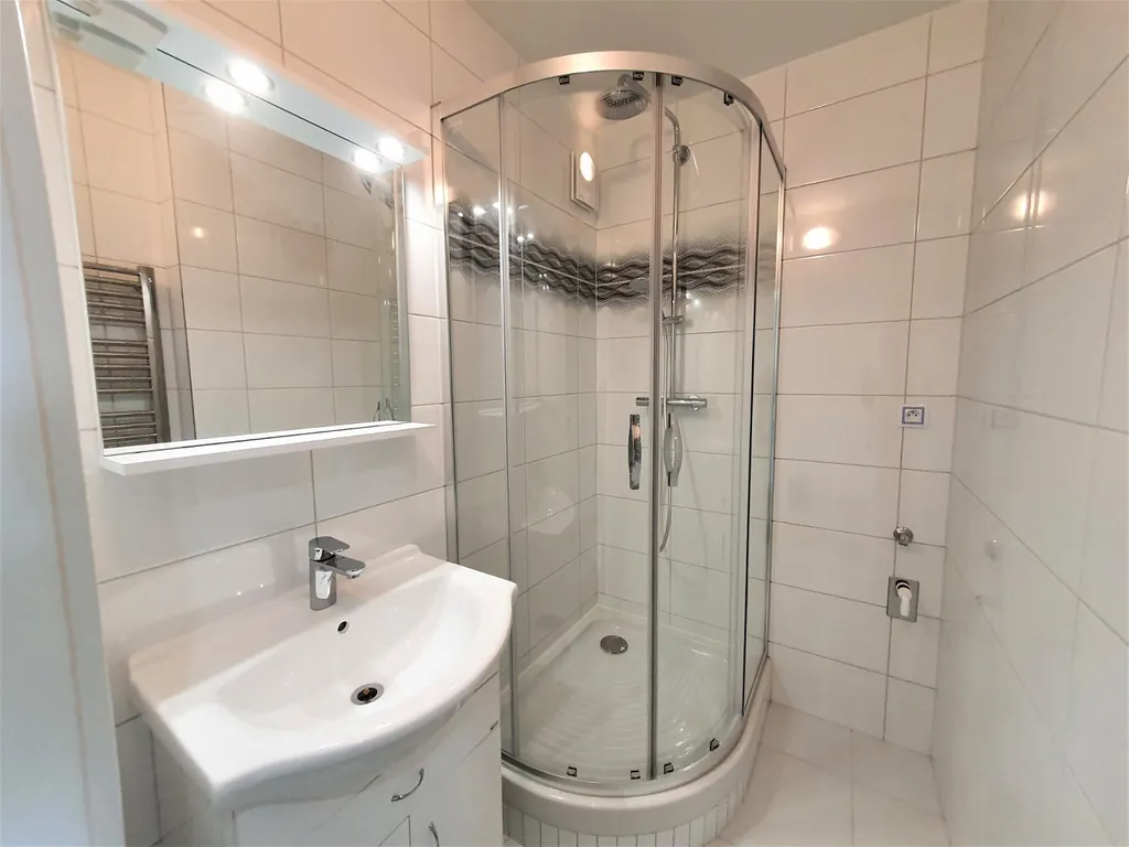 Koupelna je vybavena sprchovým koutem s termostatickou baterií, elektrickým nerezovým topným žebříkem s regulací teploty a přípojkou na pračku. Toaleta je samostatná a doplněná bidetovou sprškou. V bytě je instalován průtokový změkčovač vody pro teplou i studenou vodu.
