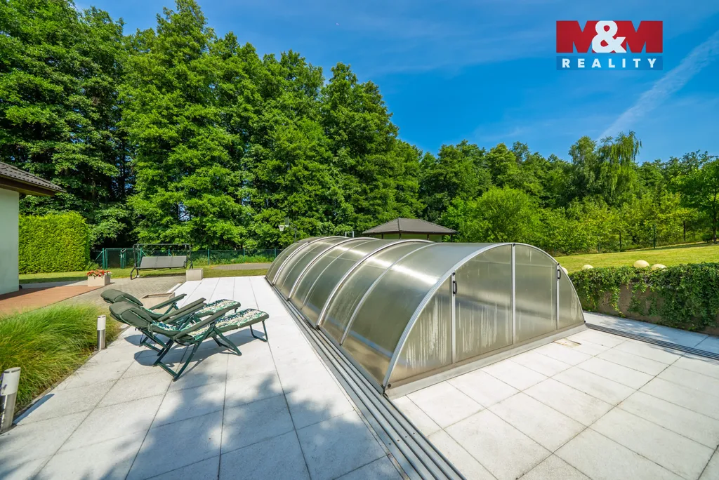 Prostorná zahrada nabízí klid k relaxaci u bazénu nebo dovádění s dětmi, dále je zde zahradní domek k uložení všeho potřebného.