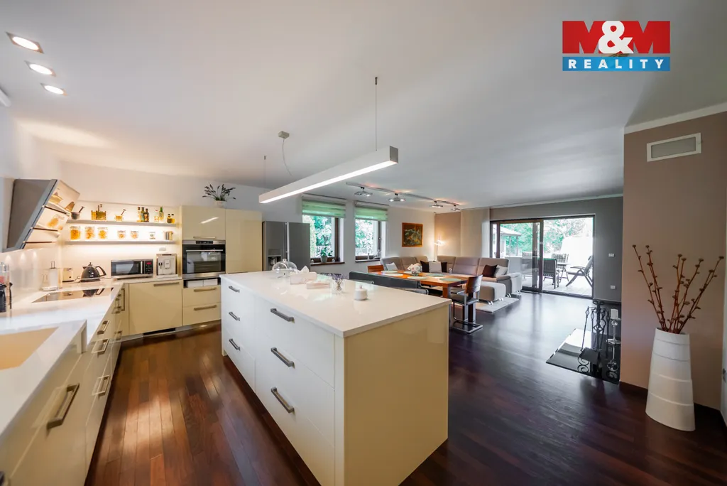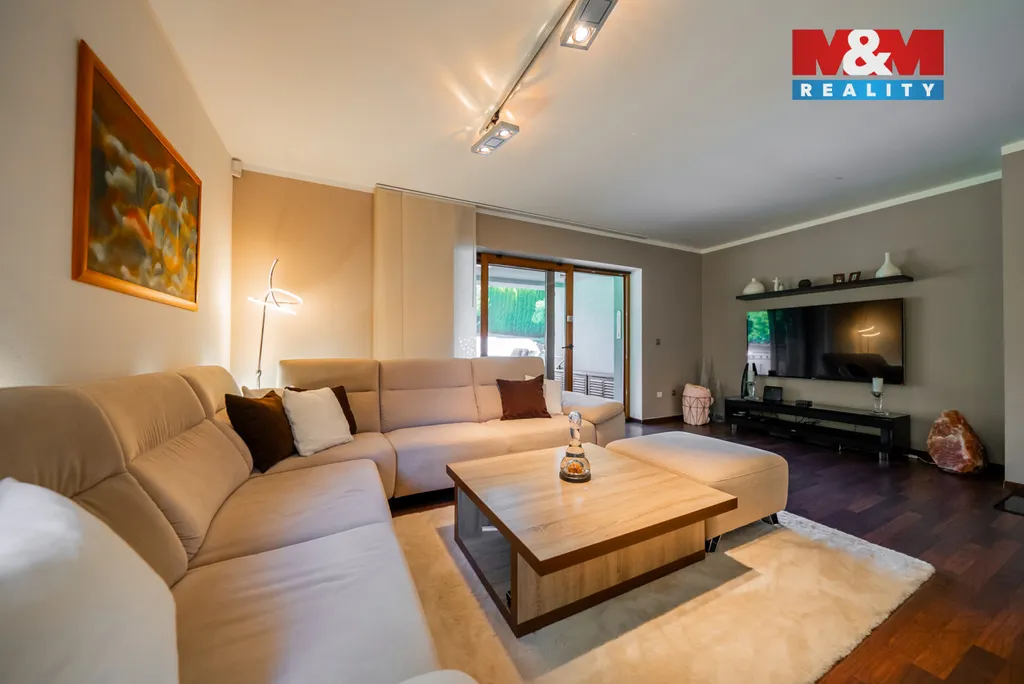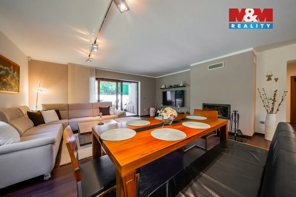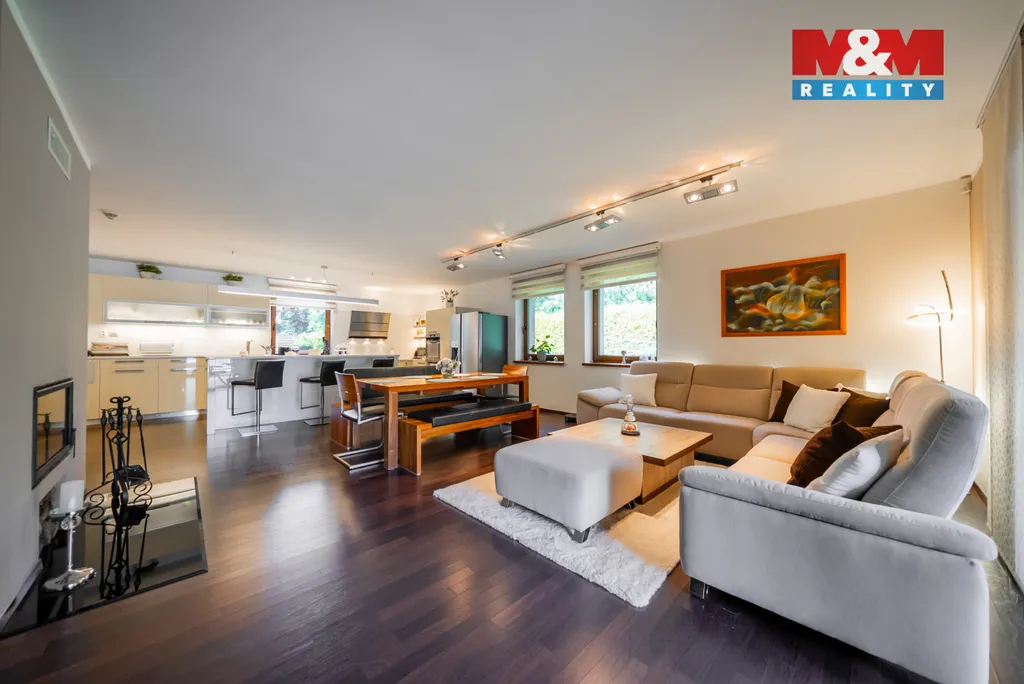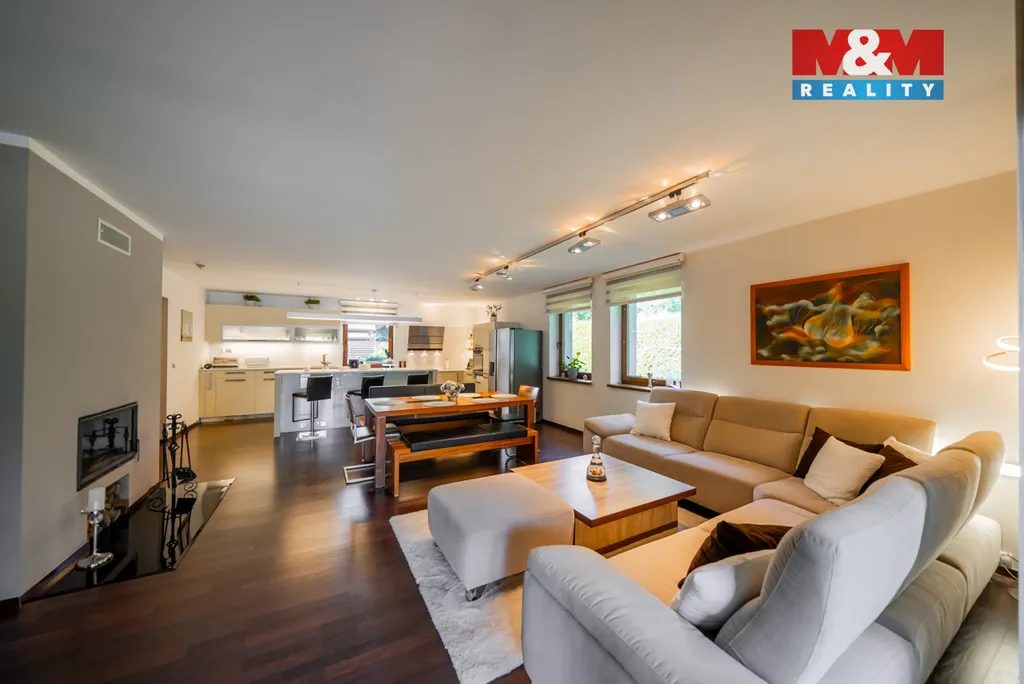 Velkorysý obývací pokoj je propojen s kuchyní a jídelním koutem, nechybí krb ani přímý vstup na terasu s výhledem do zahrady.