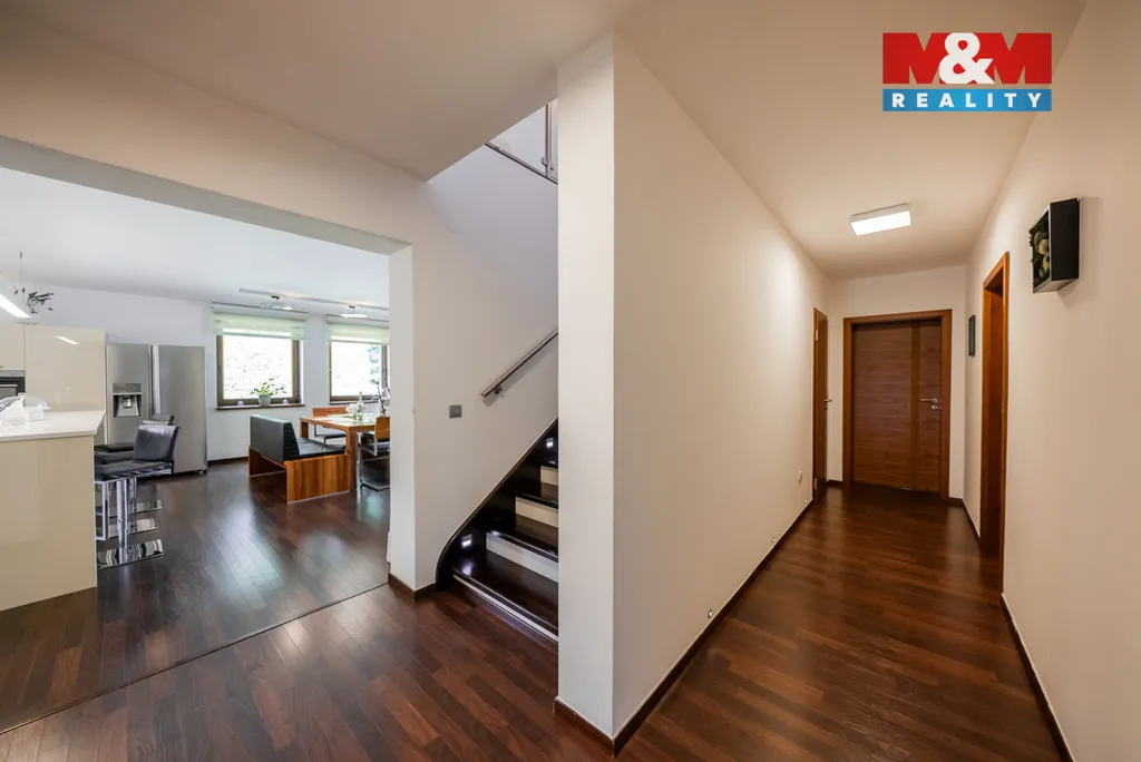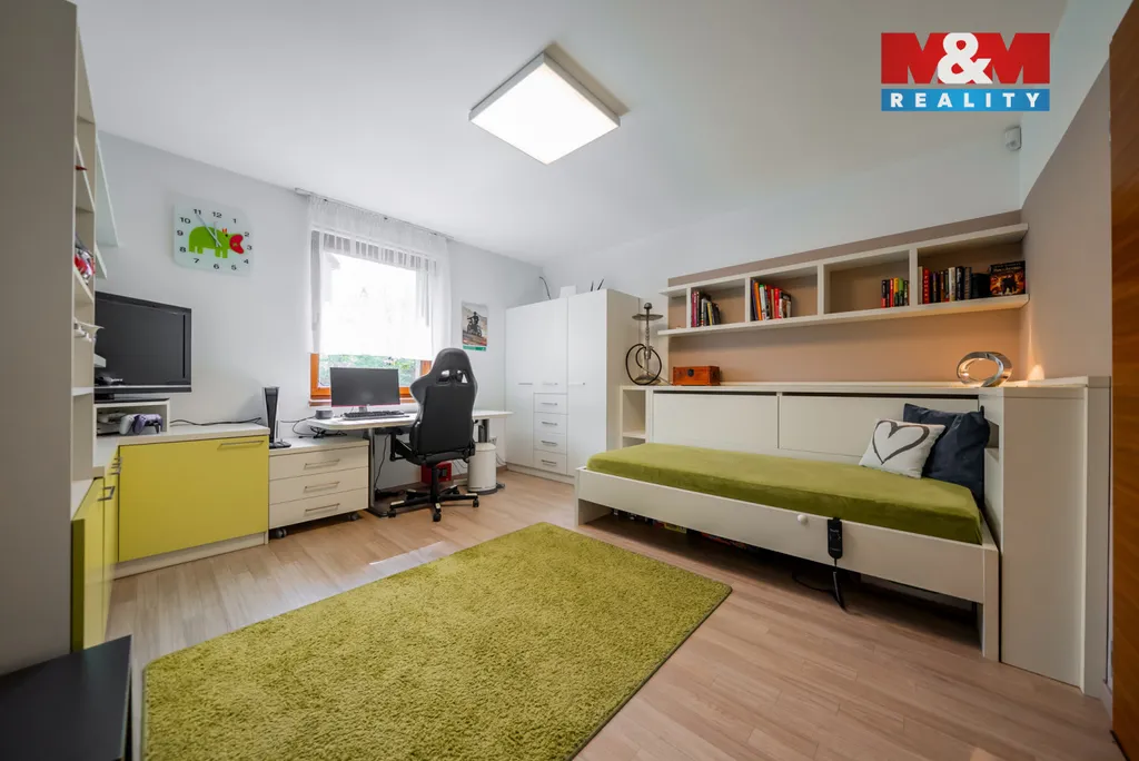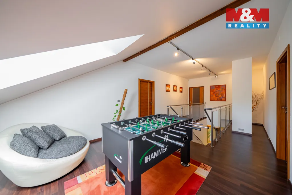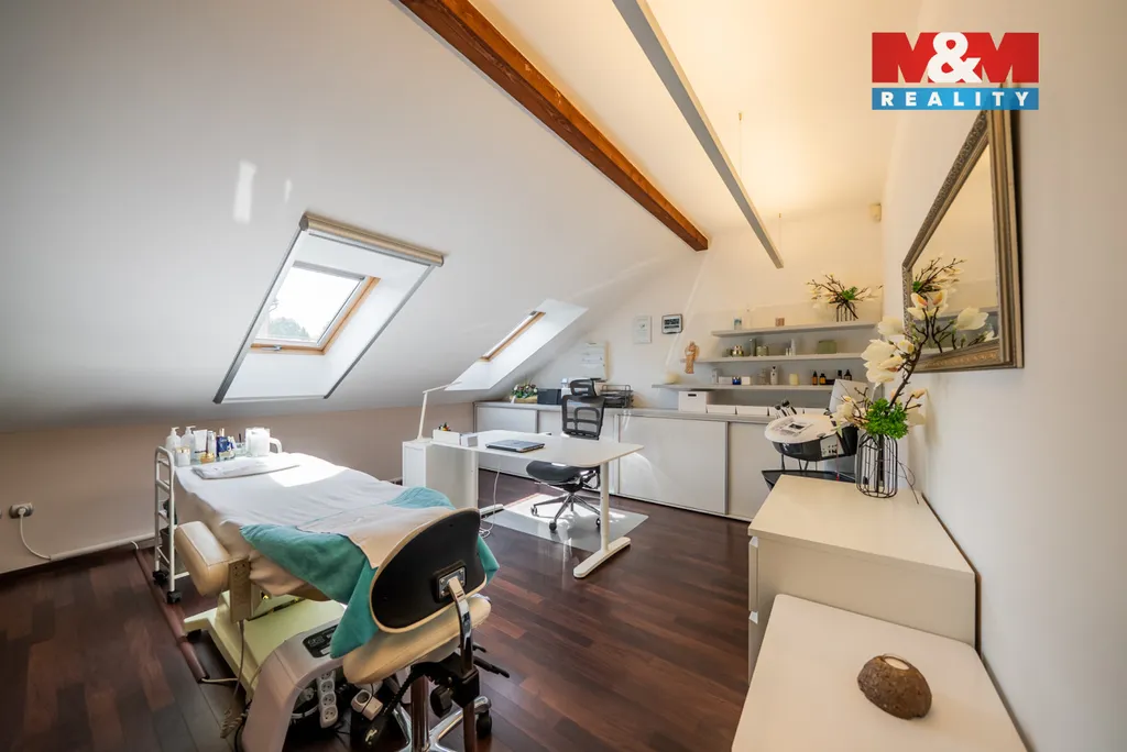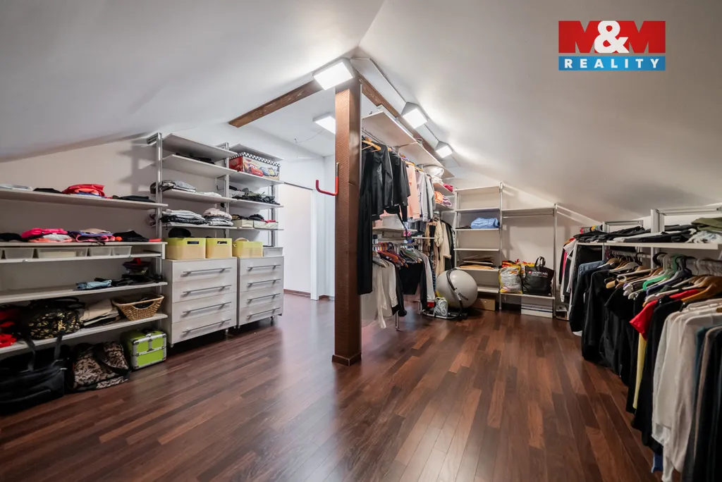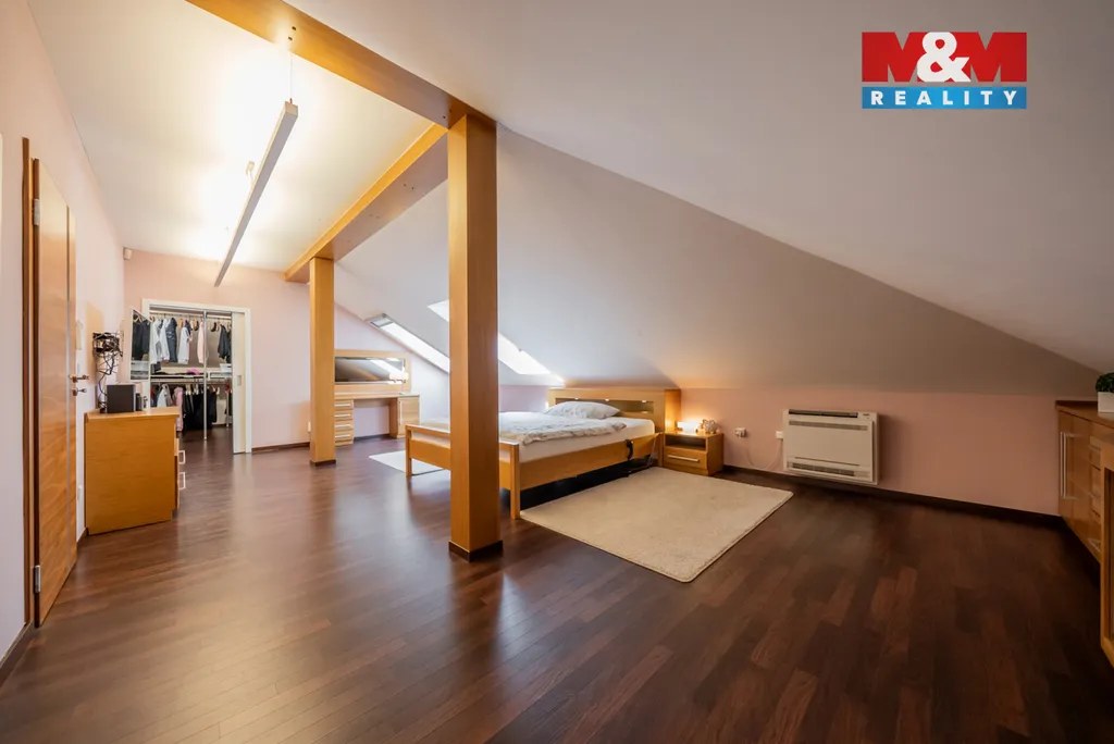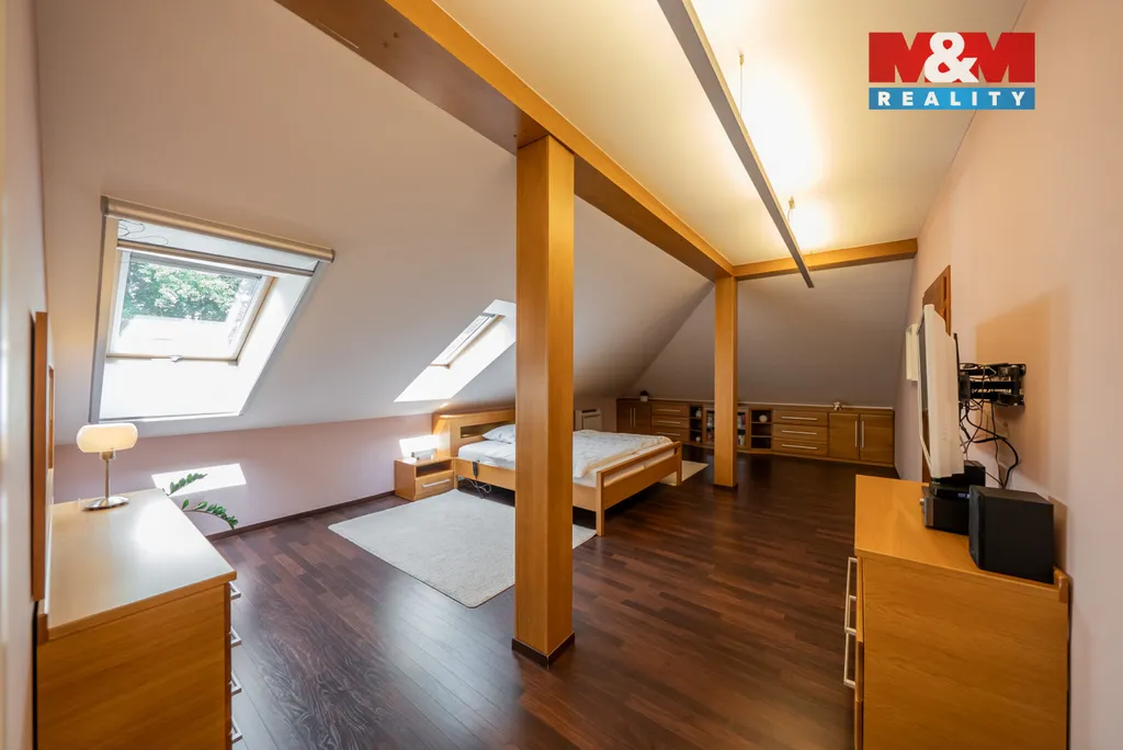 Horní patro nabízí ložnici se šatnou, pokoj a koupelnu s prádelnou. Klimatizace zajišťuje příjemné prostředí i v horkých dnech.