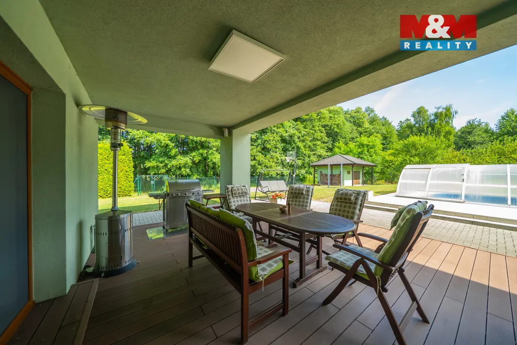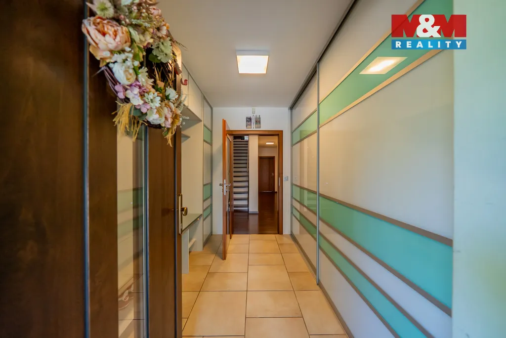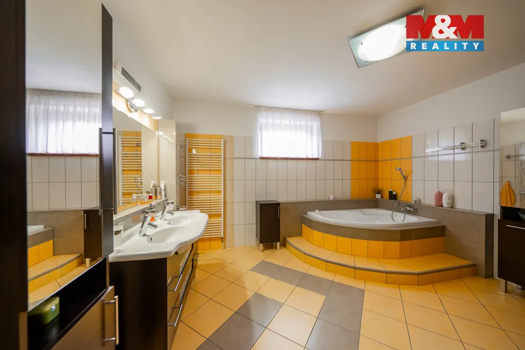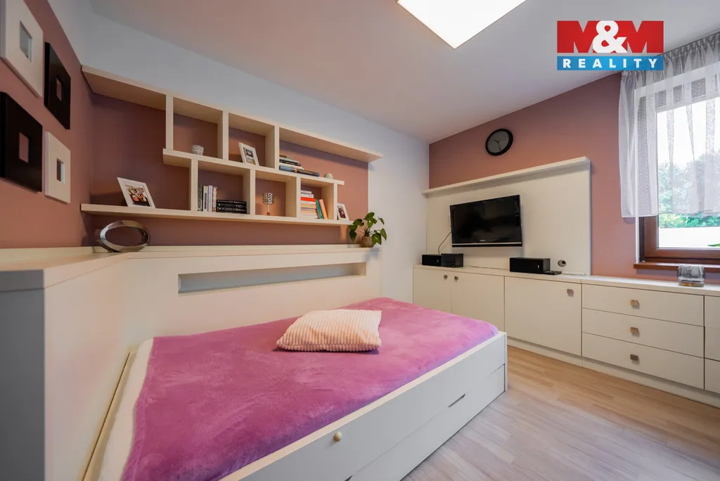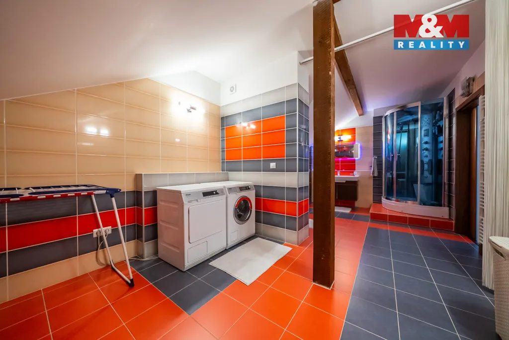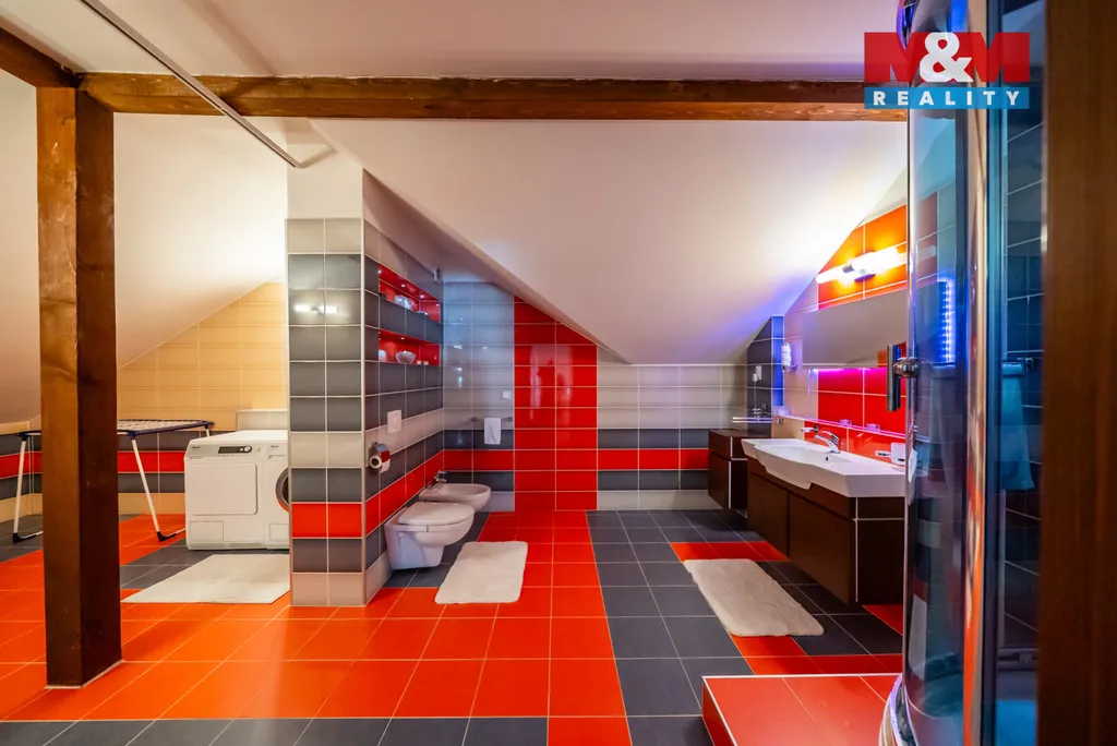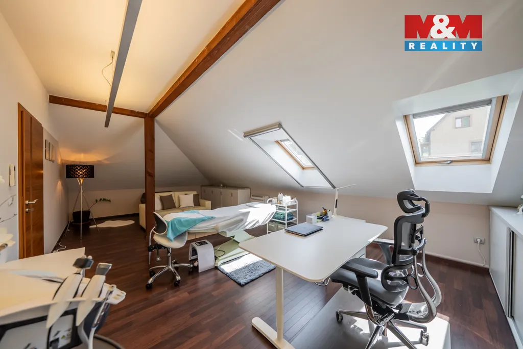 Horní patro nabízí ložnici se šatnou, pokoj a koupelnu s prádelnou. Klimatizace zajišťuje příjemné prostředí i v horkých dnech.