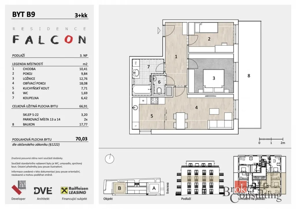 Uvedená cena zahrnuje variantu bytu ve standardním finálním provedení. Součástí je sklep (3,2 m²) a prostorný balkon (17,77 m²), jež je přístupný ze všech třech místností.