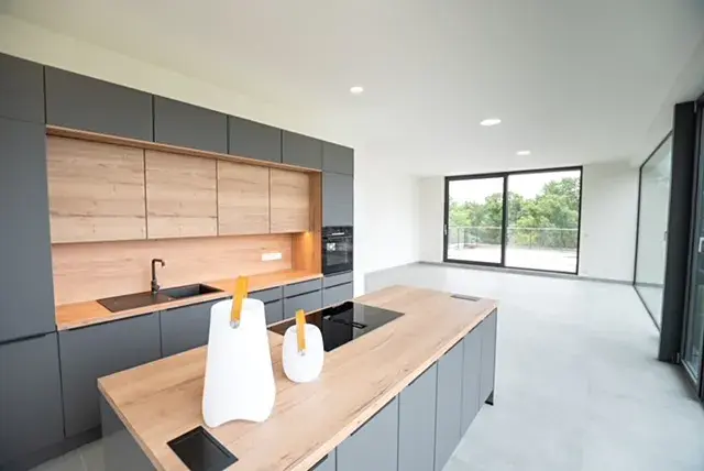 V bytě je moderní kuchyňská linka se všemi spotřebiči.