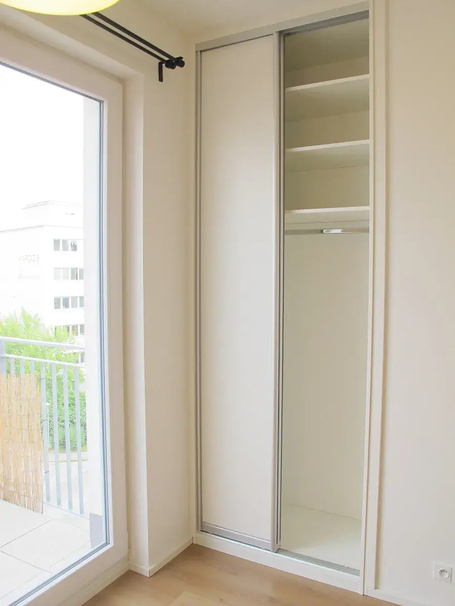 Tento moderní byt sestává z pokoje s kuchyňským koutem, koupelny s WC a předsíně. Kuchyňský kout je vybavený kuchyňskou linkou s vestavěnou elektrickou varnou deskou a pečicí troubou, velkou lednicí s mrazákem a jídelním stolem se 2 židlemi. V koupelně se nachází umyvadlo, sprchový kout, WC a pračka. V předsíni jsou úložné skříňky a knihovny s množstvím úložných prostor, ve výklenku vedle balkónových dveří je prostorná vestavná šatní skříň a nad varnou deskou odtahová digestoř. V pokoji je k dispozici manželské dvoulůžko s úložným prostorem. Byt se s výjimkou výše uvedeného zařízení pronajímá nezařízený.