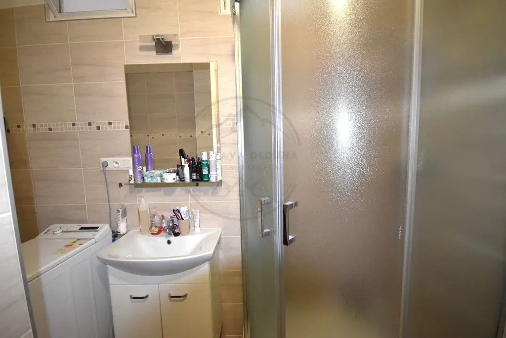 Dispozice bytu: prostorná chodba, kde se nachází skříň, věšák na kabáty, kuchyň, obývací pokoj, ložnice, prostorná koupelna se sprchovým koutem, kde se vleze pračka i sušička, samostatné WC