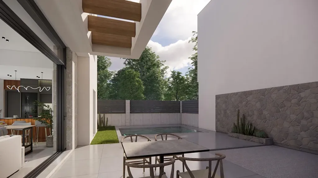 Každá vila má 110 m² obytné plochy, prakticky rozdělené do dvou pater, navržených tak, aby maximalizovaly přirozené světlo a funkčnost. Domy jsou postaveny na pozemcích od 185 m² a nabízejí rozsáhlé venkovní prostory ideální pro opalování, zábavu nebo odpočinek u soukromého bazénu.