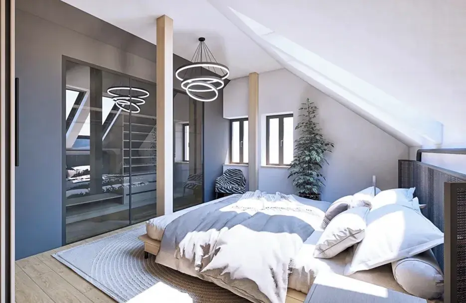 První ložnice má 18,89 m² s laminátovou podlahou a stěnami s omítkou a obkladem.