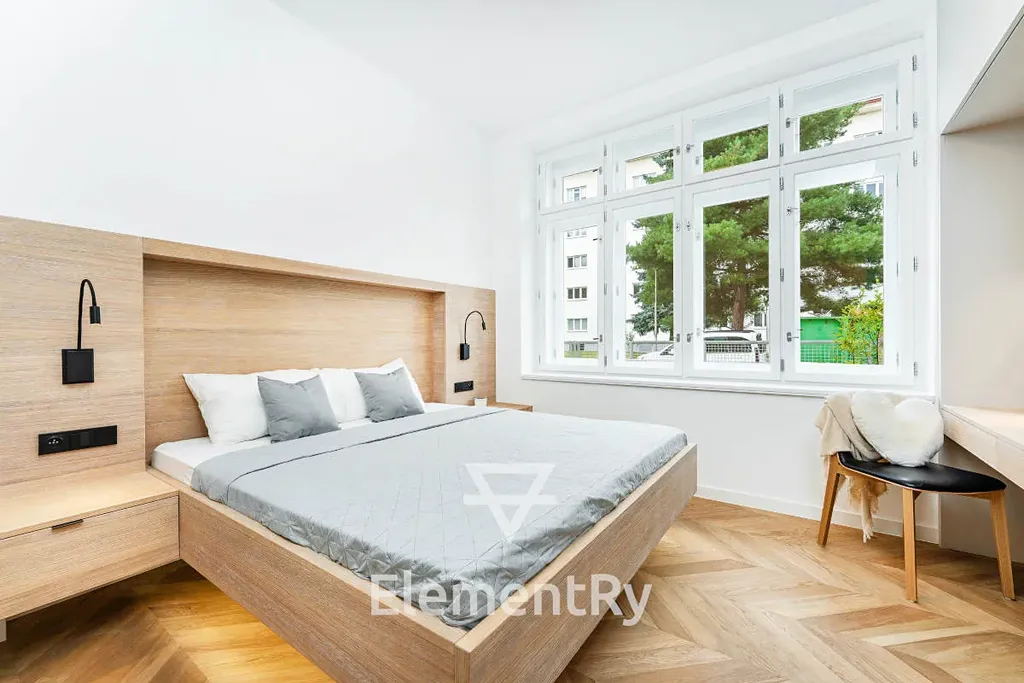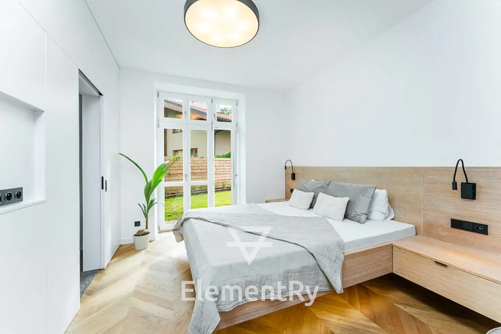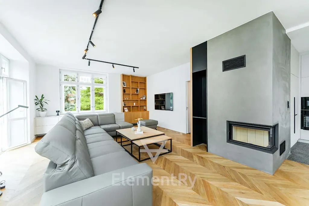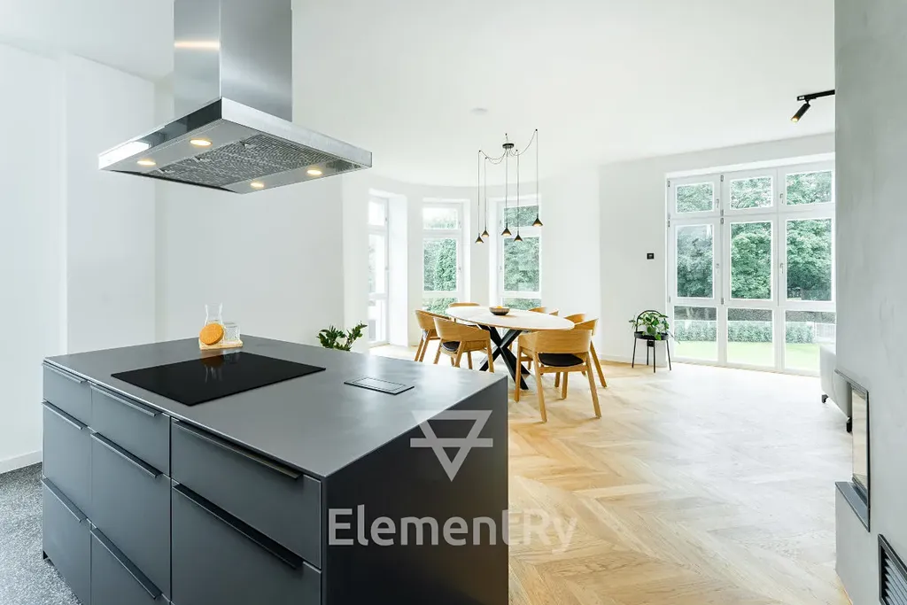 Byt samotný se nachází v prvním patře nově zrekonstruované prvorepublikové vily. Je plně vybaven zakázkovým, na míru dělaným nábytkem i kvalitními spotřebiči.