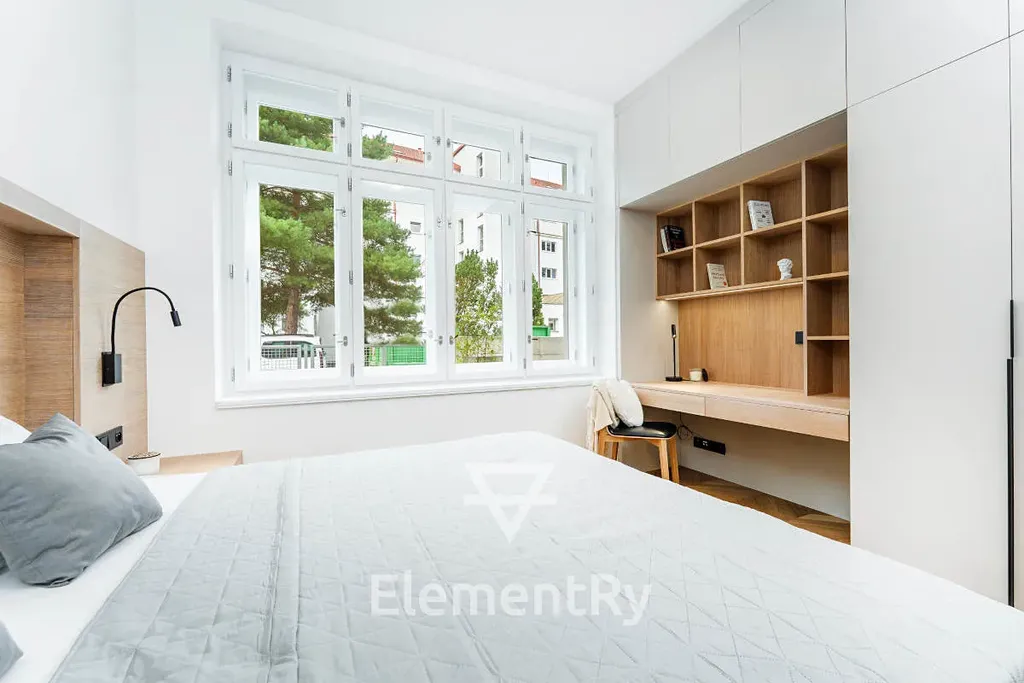 Celý byt je navržen v nadčasovém designu s použitím prémiových materiálů a poskytuje maximální komfort pro náročné klienty, kteří hledají reprezentativní a zároveň praktické bydlení.