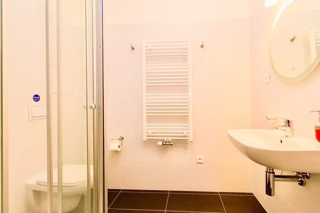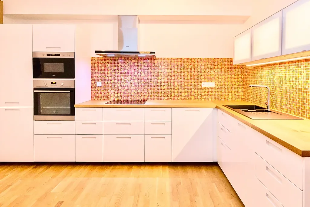 Dominantou bytu je plně vybavená kuchyňská linka s vestavěnými spotřebiči – myčkou, lednicí a indukční varnou deskou. Dispozice je velmi funkční a rodinně řešená: dvě koupelny (jedna s vanou a pračkou, druhá se sprchovým koutem a WC), samostatná toaleta a praktická komora s úložným systémem, která poskytuje dostatek prostoru pro organizaci domácnosti.