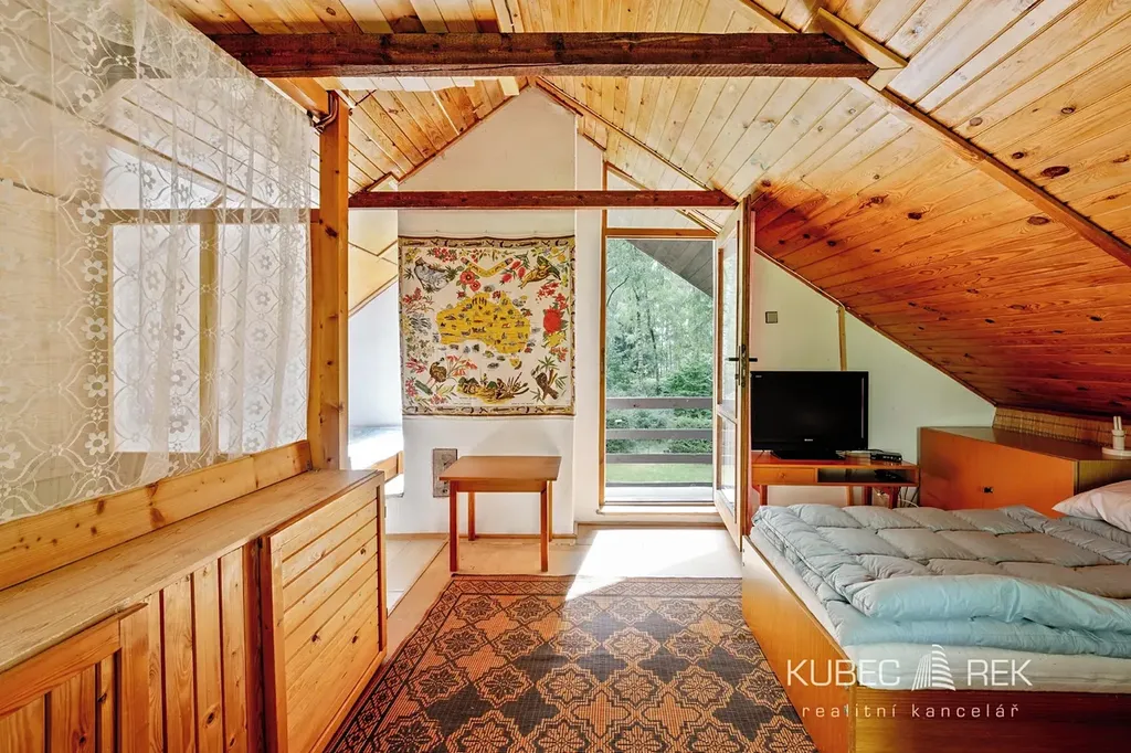 Chata je napojena na elektřinu a díky vlastnímu vrtu neřešíte vodu, odpad je sveden do septiku. V chladnějších dnech vás zahřeje krb na dřevo, teplou vodu zajišťuje bojler. A když zatoužíte po chvíli venku? Stačí otevřít dveře na balkon a vychutnat si výhled na zeleň bez sousedských zdí. Chata disponuje hezkou terasou z vyskládaného kamene.