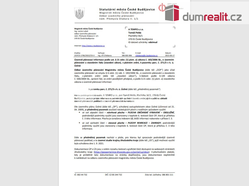 Dumrealit.cz Vám zprostředkuje prodej stavebního pozemku o rozloze 1.632 m² v Úsilném ve městě České Budějovice. Prodávaný pozemek par. číslo 271/3 v kú Úsilné je dle Územního plánu města České Budějovice vedený z 1/2 jako plocha občanského vybavení a z 2/2 je pozemek veden k rekreaci. U hranice pozemku vede elektřina, po smluvním ujednání s E.gd možnost parcelu napojit na distribuční síť. Ve vzdálenosti cca 400 m vede plyn, vodovod a kanalizace. Pozemek lze s menšími úpravami využít k rekreaci (zahrada). K pozemku se dostaneme po obecní prašné komunikaci. Doporučuji prohlídku, pozemek se nachází cca 10 minut od centra města České Budějovice. K dispozici máme kompletní zákres inženýrských sítí, Územně plánovací informaci s možnostmi výstavby a využití pozemku. Možnost koupě i 2 pozemku vyznačeného oranžově na fotografiích, par. č. 269/4 zapsané na LV 167 v k.ú. Úsilné. Více informací Vám poskytne realitní makléř Tomáš Pelda z realitní kanceláře A TEMPO fungující pod ochrannou známkou dumrealit.cz. Ev. číslo: 654875.