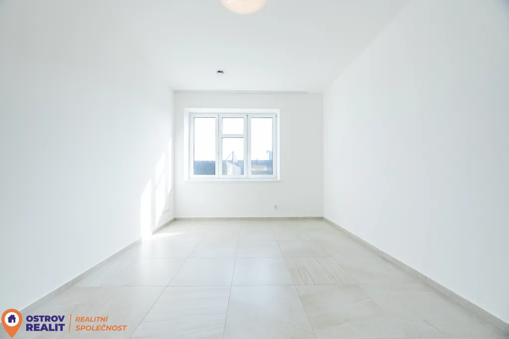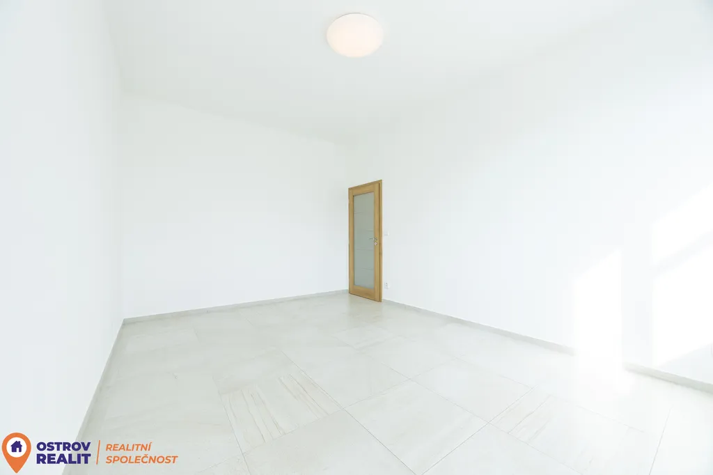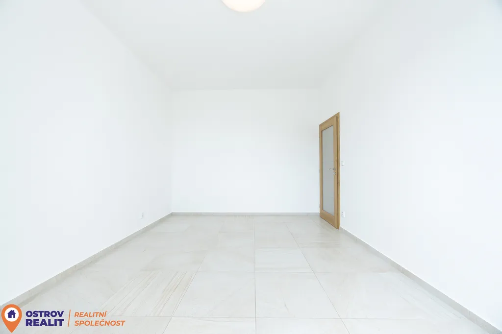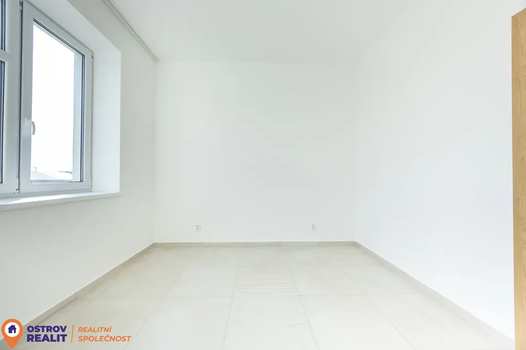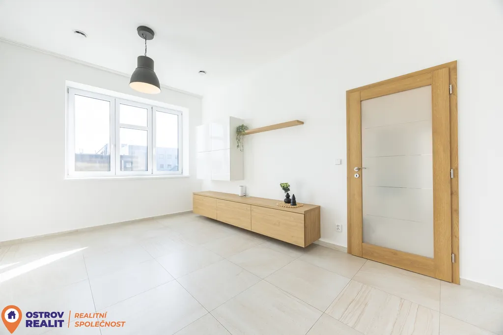 Srdcem bytu je otevřený obytný prostor s kuchyní, který přirozeně vybízí k setkávání s rodinou i přáteli. Dominantou místnosti je krb, jenž dodává interiéru jedinečnou atmosféru, zatímco velkoformátová šedá dlažba podtrhuje čistý, moderní styl. Z chodby se přes designové posuvné dveře vstupuje do útulné ložnice. Byt dále nabízí další velký pokoj, ideální jako dětský pokoj, pracovna nebo pokoj pro hosty.