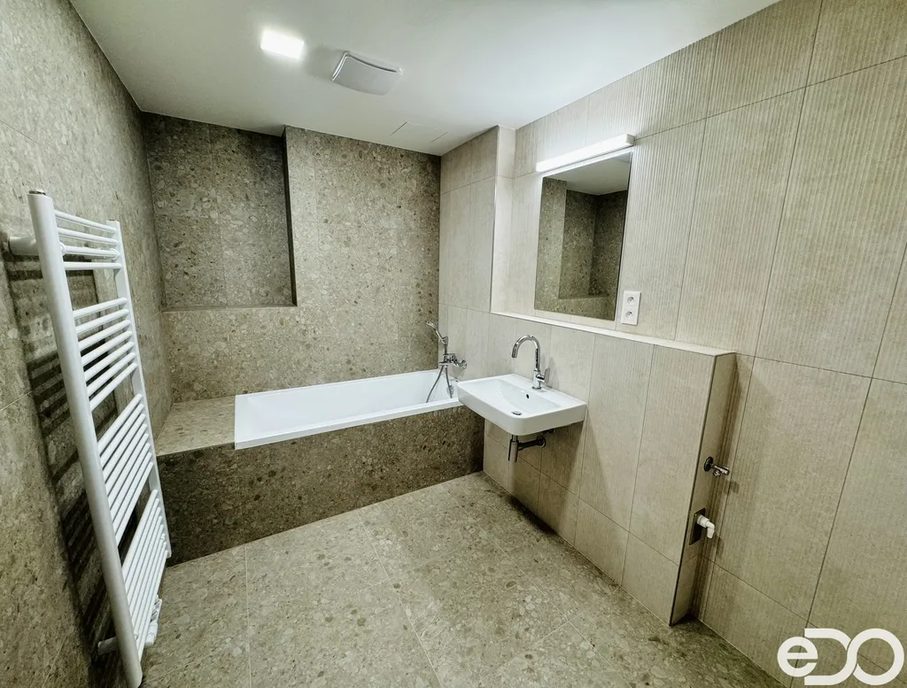 Byt se nachází v cihlové novostavbě a čeká na své první nájemníky. Moderní dispozice nabízí prostorný obývací pokoj s kuchyňským koutem, ložnici, předsíň, koupelnu s vanou a samostatnou toaletu s umyvadlem. Z obývacího pokoje i ložnice je vstup na lodžii o výměře 6 m², která poskytuje příjemné místo k relaxaci. Jednotka je orientována na jihozápadní stranu. Součástí bytu je moderní kuchyňská linka, která je vybavena veškerými spotřebiči: elektrická trouba, indukční varná deska, digestoř, myčka a lednice s mrazákem. V ložnici je k dispozici prostorná vestavěná skříň, v předsíni pak skřín s dalším úložným prostorem. Vytápění je zajištěno tepelným čerpadlem, stejně jako ohřev vody. Okna a dveře k lodžii jsou hliníková, podlaha pak vinyl a keramická dlažba. K bytové jednotce dále náleží zděný sklep (3 m²) a garážové stání, které je za příplatek 1 800 Kč měsíčně.