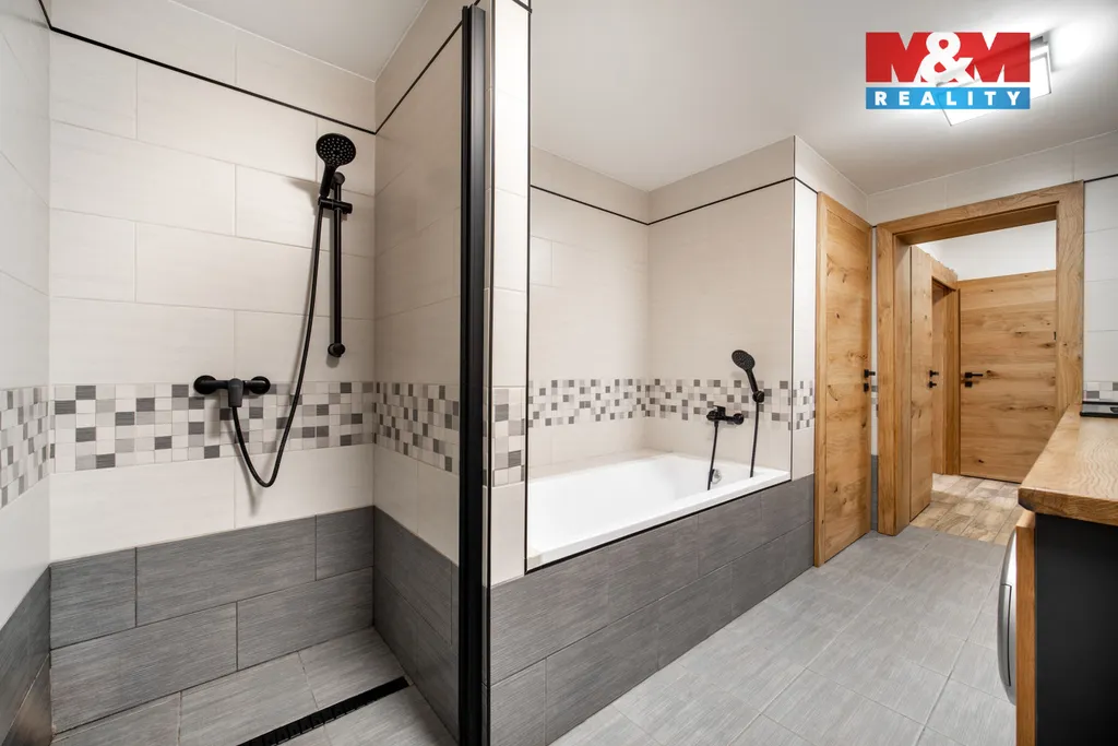 V patře jsou umístěny další obytné místnosti – ložnice, dětský pokoj se vstupem na balkón a šatna. Horní část domu je určena k částečnému dokončení, což nabízí možnost úprav dle vlastního vkusu.