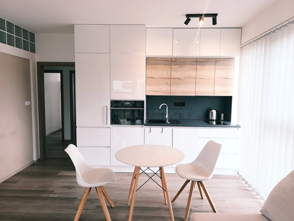Byt je částečně zařízený. K dispozici: kuchyňská linka, indukční varná deska, elektrická trouba, digestoř, lednice s mrazákem, myčka, pračka se sušičkou, vestavěné skříně.
