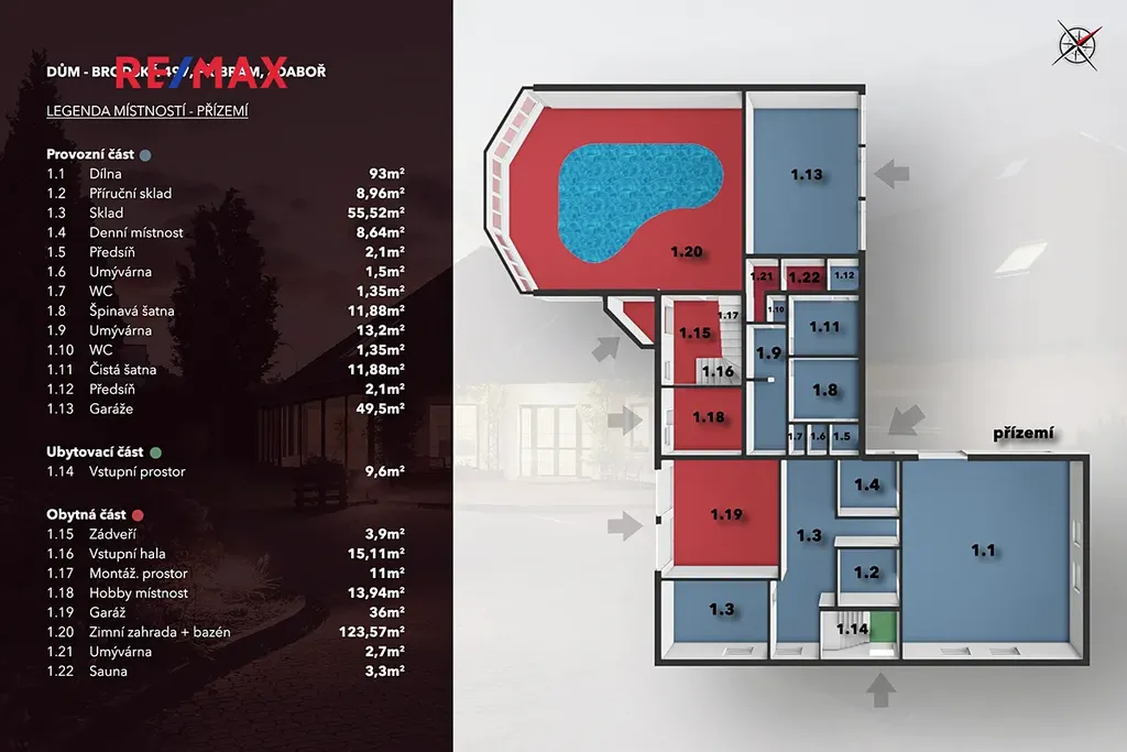 Zázemí pro podnikání či koníčky: technické prostory, dílny, sklady, šatny a WC – samostatná provozní část domu.
