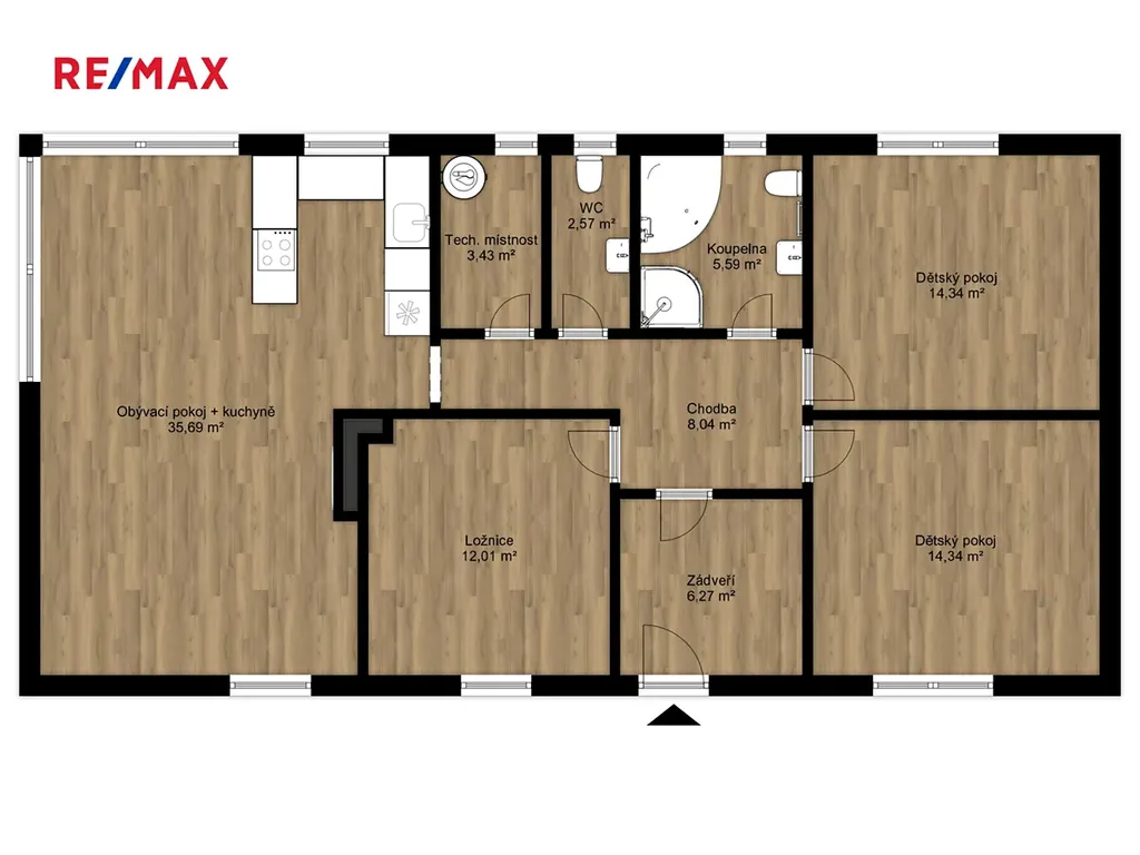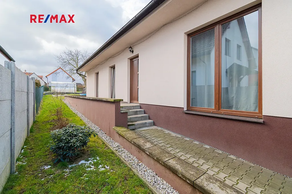 Dispozičně je rozdělena na velkorysý obývací prostor s kuchyňským koutem a se vstupem na zahradu, dále na tři ložnice, koupelnu s WC, samostatné WC, technickou místnost, chodbu a prostornou předsíň.