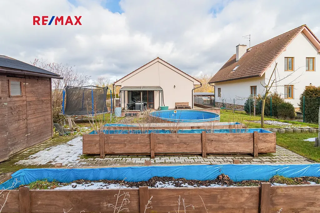 Před domem je parkoviště pro tři automobily, za domem pak nalezneme relaxační zónu s terasou a bazénem. Ale také se skleníkem a vyvýšenými záhony. Srdce zahradníka zaplesá.