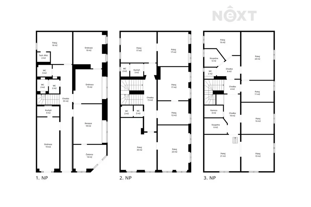 Vystoupáme-li do třetího nadzemního podlaží dostáváme se k obytné části budovy. Zde jsou rozpracovány dva mezonetové nadstandardní byty v základním provedení 3+kk a 2+kk. Využitím prostoru v podstřeší může vzniknout takřka neomezená obytná výměra.