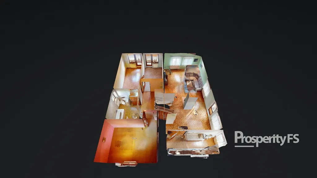 Prostorný obývací pokoj propojený s jídelnou (přes 30 m²), samostatná kuchyně s komorou, ložnice, dva další pokoje, koupelna a samostatné WC.