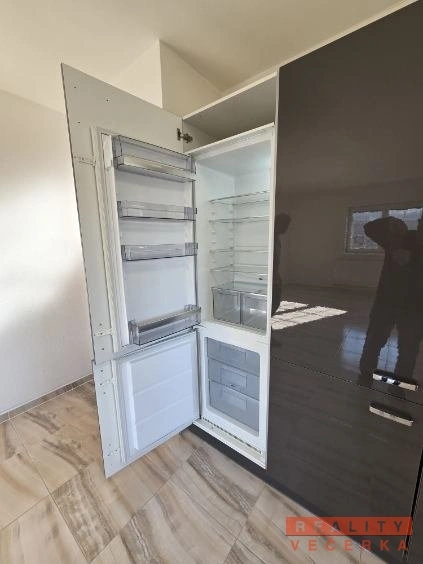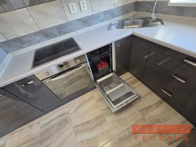 Kuchyně je plně vybavená – elektrický sporák a pečící trouba, lednička, mrazák, myčka nádobí, digestoř, úložné prostory, police na potraviny a nádobí.