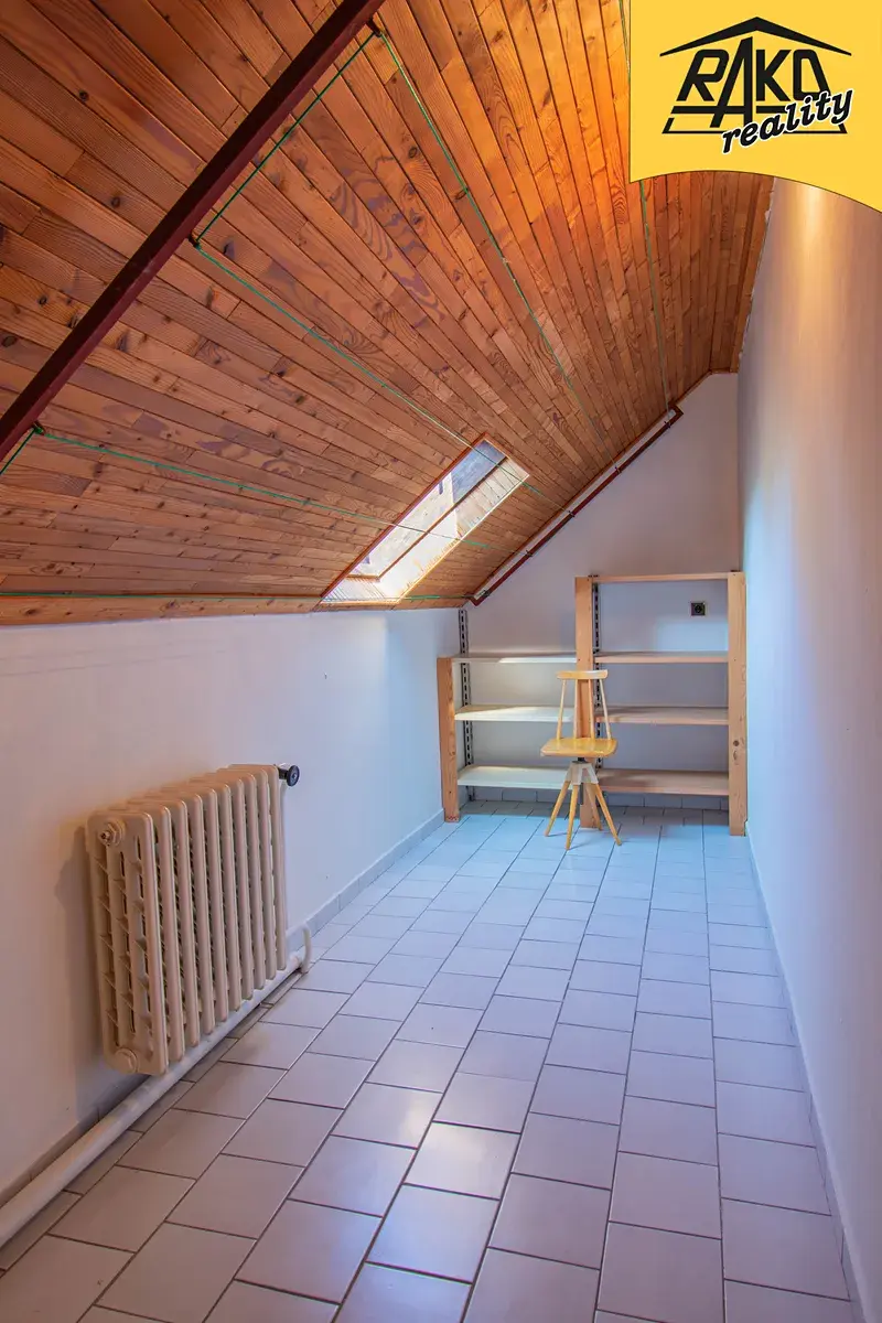 Dispozice: vstup do domu, v 1.NP po je po levé straně umístěna kuchyň, která je propojená s obývacím pokojem (20 m2). Též je zde schodiště do dalšího patra. Ve středu je umístěna koupelna se sprchovým koutem (5,5 m2) a samostatné WC (1,7 m2). V levé části domu je sklad potravin (1,8m2), dále menší pokoj/pracovna (9 m2) a technická místnost (7,5 m2). Z té možný vstup do skladu paliv. Ve 2.NP je podesta, po levé straně jsou umístěny dva pokoje (15 m2 a 17 m2). Ve středu je samostatné WC s umyvadlem (1,8 m2), vedle je úložný prostor určený k sušení prádla, po pravé straně je prostorná ložnice (17 m2) se vstupem na terasu (20 m2), dále šatna (4,1m2). Dům má plastová okna, která jsou opatřena žaluziemi, některé místnosti mají stropy obložené dřevem. Jako podlahové krytiny na chodbě a v koupelně dlažba, v obývacím pokoji koberec, a v dalších obytných místnostech lino, koberec nebo plovoucí podlaha. Topná tělesa v domě jsou praktická litinová. Dům je částečně podsklepený, má pouze malý sklep na potraviny.