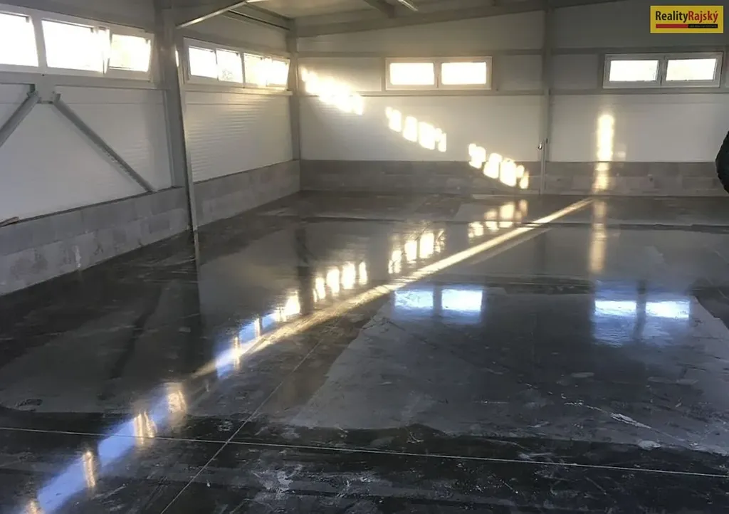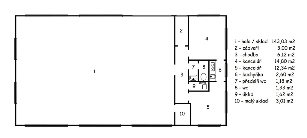 Celý moderní objekt je tvořen skladovou halou o rozloze 143 m2, dále jsou zde dvě kanceláře (14.8 m2 a 12.3 m2), kuchyňka (2.6 m2), malý sklad (3 m2), úklidová místnost, sociální zařízení (wc, umyvadlo), chodba a vstupní zádveří.