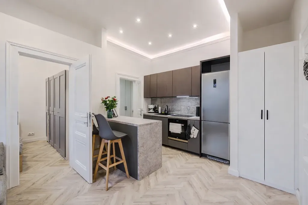 Obývací pokoj s designovým nábytkem a plně vybavenou kuchyní (trouba, lednice, mikrovlnka, varná deska, pračka, bar).