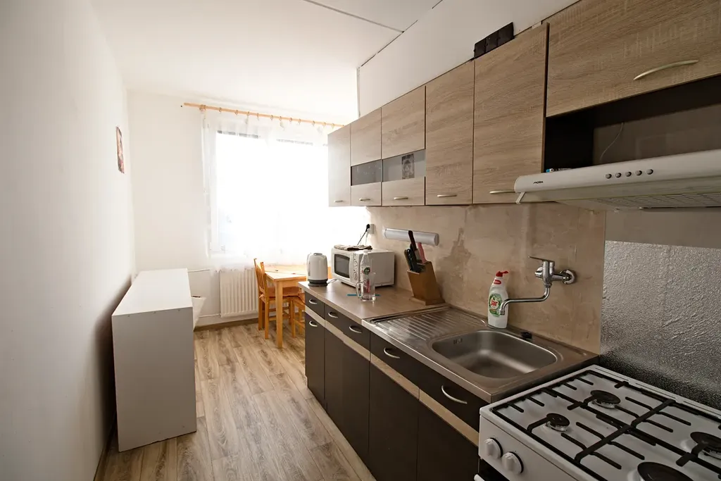 Nabízíme k prodeji bytovou jednotku 1+1, která se nachází ve čtvrtém nadzemním podlaží panelového domu bez výtahu. V bytě je původní umakartové jádro, plastová okna, nová kuchyňská linka a nové podlahy pokryté linem. K bytu náleží sklepní kóje a možnost užívat balkon v mezipatře. Měsíční náklady do fondu oprav je 1515,-Kč.