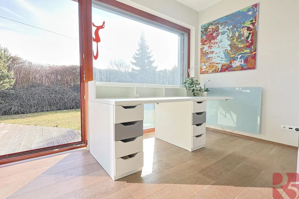 K dispozici jsou tři pokoje, velká koupelna s vanou i sprchou, finská sauna, technická místnost a komora, prostorný sklep a dvě garážová stání v suterénu domu. Pro uložení zahradních věcí poslouží zahradní domek.